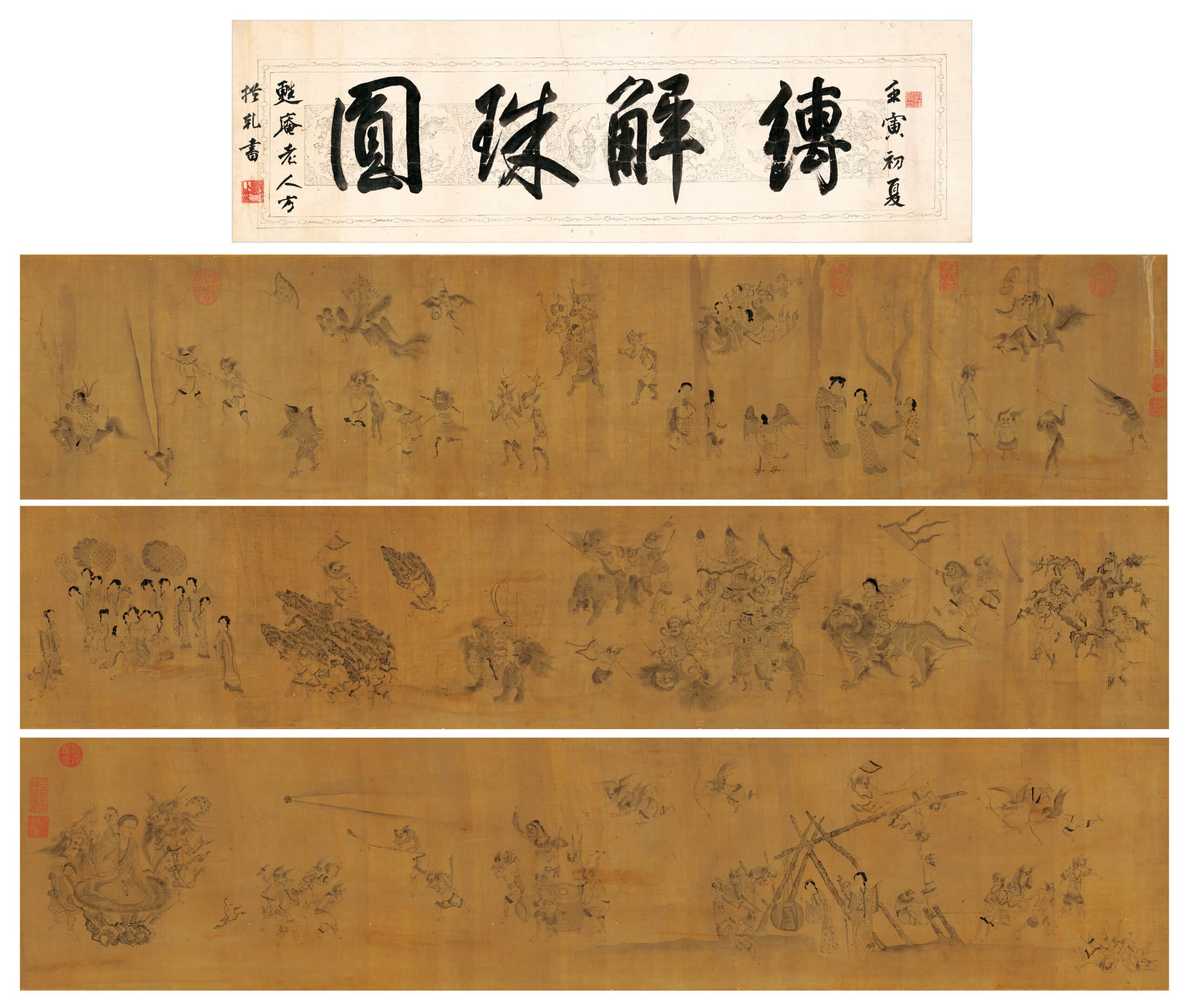 〈揭缽圖卷〉取材自佛教《雜寶藏經》中「鬼子母改惡從善」的經典故事,作品細膩刻劃鬼母從暴虐殘忍到虔誠皈依的轉變過程,深刻體現佛法教化對心靈的覺醒與昇華,全卷以水墨工筆精繪於素絹之上,將深奧的佛教經典轉化為富有敘事張力的視覺篇章,既傳遞宗教義理,亦寄寓對人性覺悟的深刻思考,此作所展現的「以線傳神」之藝術境界,恰與西園雅集中文人「以藝載道」的精神追求遙相呼應,共同勾勒出北宋士人融合藝術、修行與生命關懷的廣闊視野。