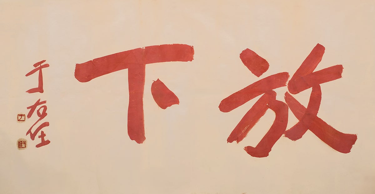 這鮮紅澤色並非消極的放棄,而是熱烈飽滿的生命宣告,赤紅墨色正映照其歷經滄桑後「大肚能容」的入世襟懷。不同於弘一的高冷,于右任的硃砂《放下》充滿了「熱」與「力」;對當代藏家而言,這種「拿得起,放得下」的磅礴氣度,更能引發靈魂深處的共鳴,是一件既能鎮住廳堂、更能安頓心靈的傳世重器。