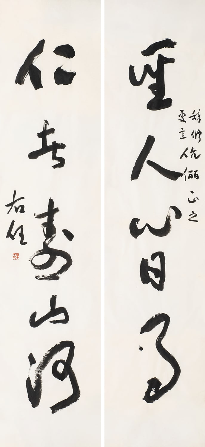 LOT5010 于右任 (1879-1964) 《聖人仁者》水墨紙本 軸,226 x 53 cm x 2,上款人|辭修曼意伉儷,預估價NTD : 180,000-360,000
