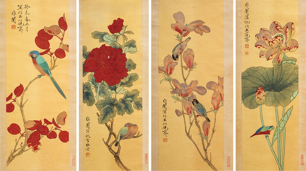 LOT6065 于非闇 (1889-1959) 《四季花鳥屏》設色灑金紙本 軸,1943年作,63 x 21.5 cm x 4,藏印|榮寶齋珍藏,預估價NTD : 1,900,000-3,800,000