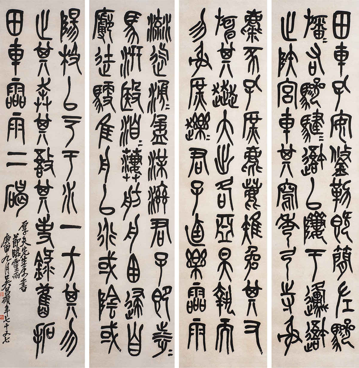 人書俱老的廳堂鉅制:相較於故宮本的案頭小品,本組四條屏通篇臨寫《靈雨》段落,篇幅宏大、氣勢磅礡。作於77歲高齡,線條圓勁如鐵,墨色變化劇烈,展現了吳昌碩晚年「人書俱老」的雄強氣象,是專為廳堂展示創作的博物館級鉅跡。