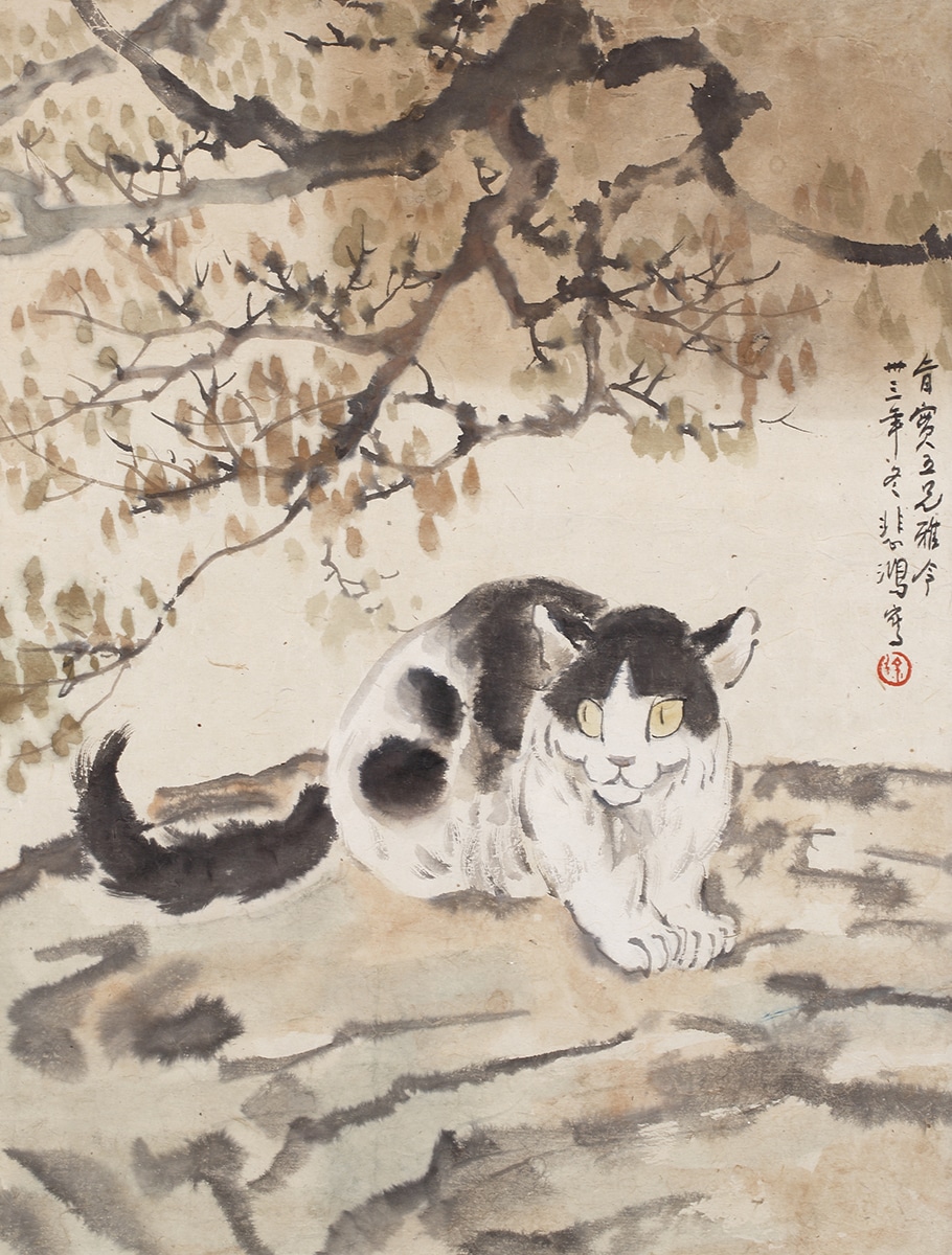 中西融和的成熟典範:作於1944年(甲申)冬日,正值徐悲鴻藝術成熟期。畫中黑白花貓以紮實的西畫造型捕捉骨骼與皮毛質感,雙目點染藤黃充滿靈性;背景則以傳統水墨寫意寫虯枝寒葉。前景嚴謹寫實與背景揮灑寫意相得益彰,極具感染力 。