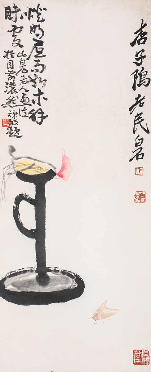 象徵主義題材:齊白石畫作中,燭火與飛蛾的主題並不少見。畫家以簡約筆墨——濃墨燈臺、朱紅火焰、淡墨飛蛾,營造出強烈的黑紅對比與動靜張力。這不僅是寫生,更寄託了對人生宿命與光明追尋的深刻哲思,是其晚年「以拙寓智」的經典 。