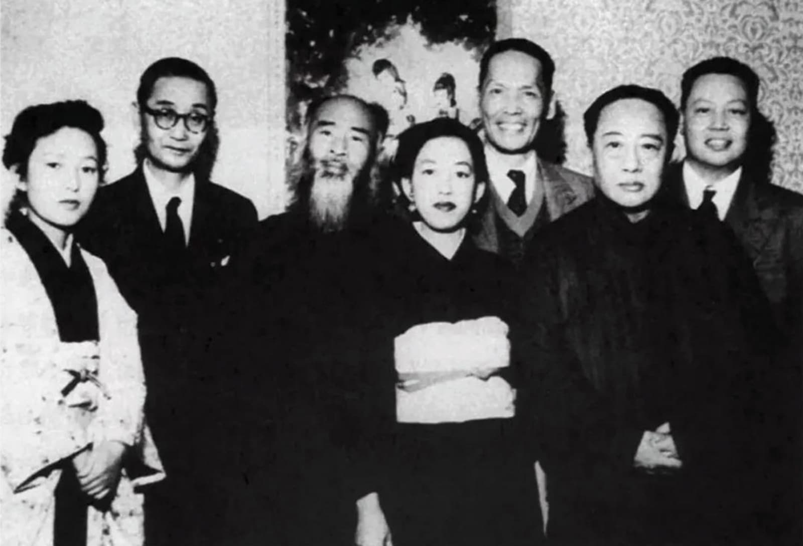 照片: 左起為伊藤啟子、莊嚴、張大千、山田喜美子、黃君璧、溥儒與莊禹靈 1955 年合影於日本東京。