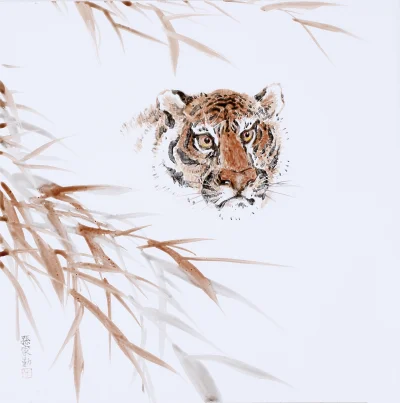 回顧關於畫虎的歷史:依據考古的發現到了漢代才有較多的相關資料,如畫像磚或其他器物的紋飾。可推知當時應有一些畫虎之作,如通溝(吉林集安)漢墓壁畫的〈狩獵圖〉,即有獵人追射老虎的畫面,至於畫在紙絹之作,因保存困難而失傳。