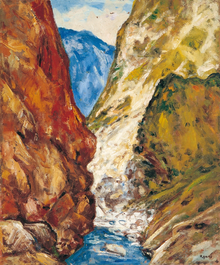 〈橫貫公路〉為楊三郎以豐富的色彩與交錯的線條,堆疊出峽谷深壑鬼斧神工、氣象萬千的意象。