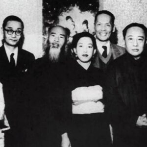 照片: 左起為伊藤啟子、莊嚴、張大千、山田喜美子、黃君璧、溥儒與莊禹靈 1955 年合影於日本東京。